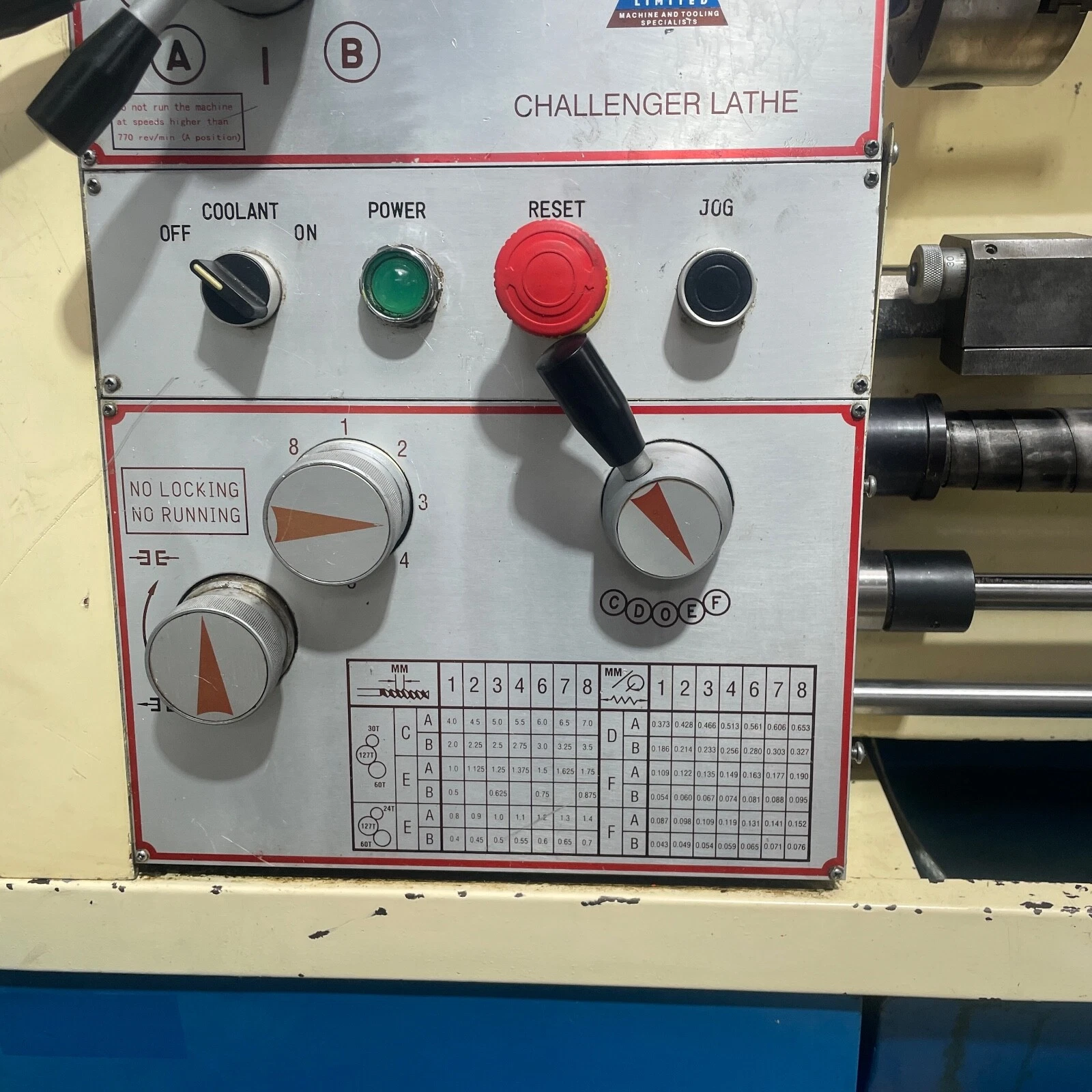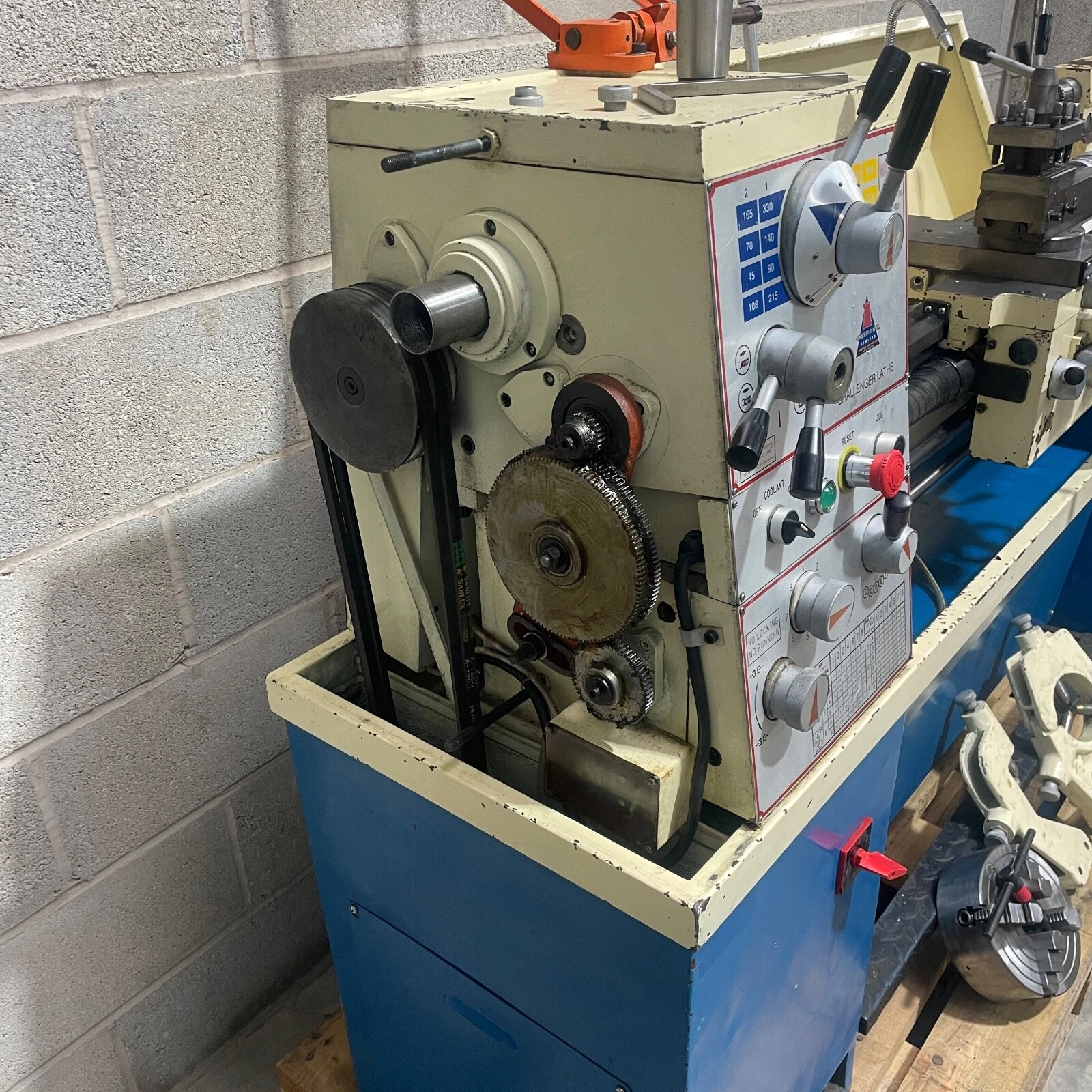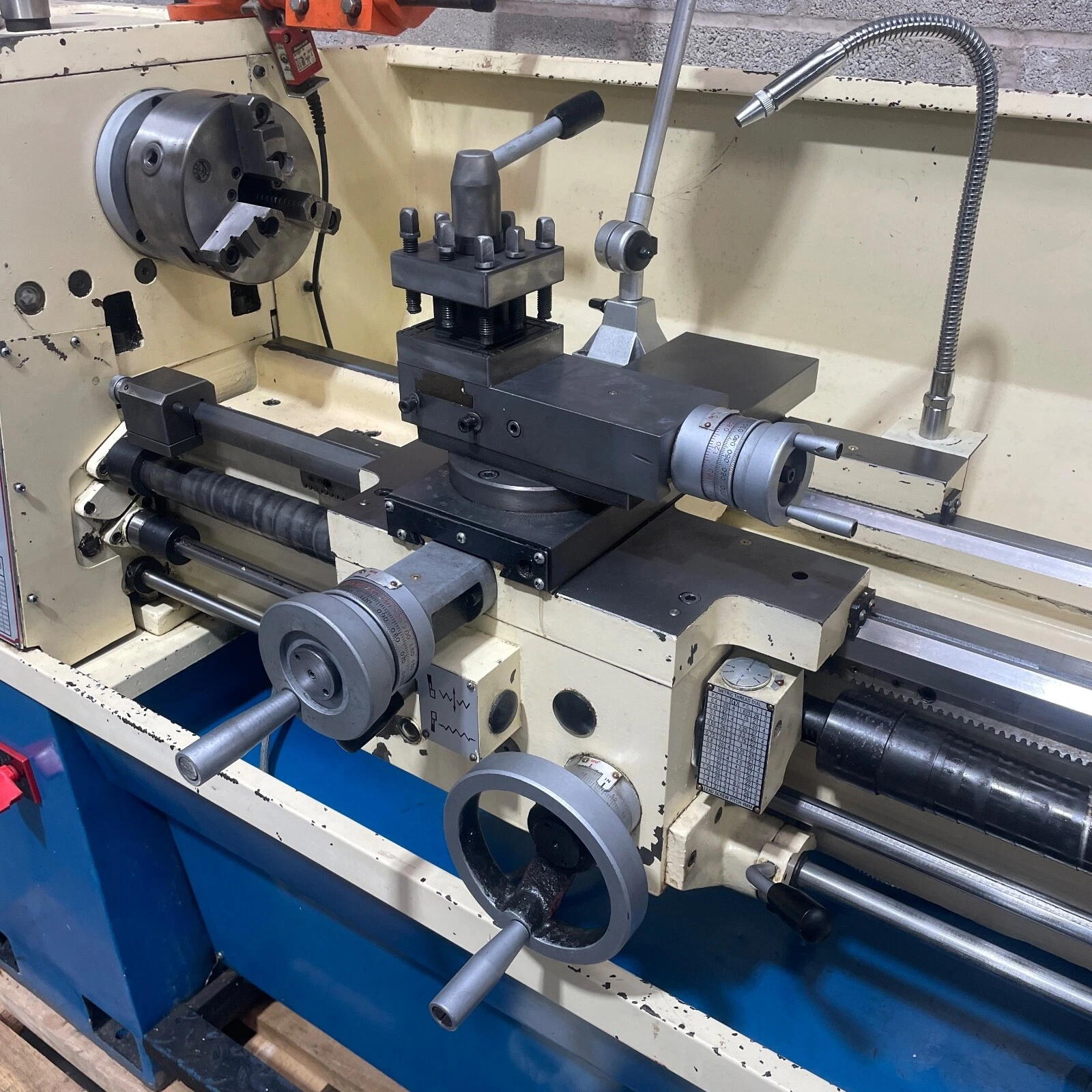 Fitted with a 4 way tool post, machine light, coolant pump, thread dial indicator, micrometer bed stop and leadscrew guards.